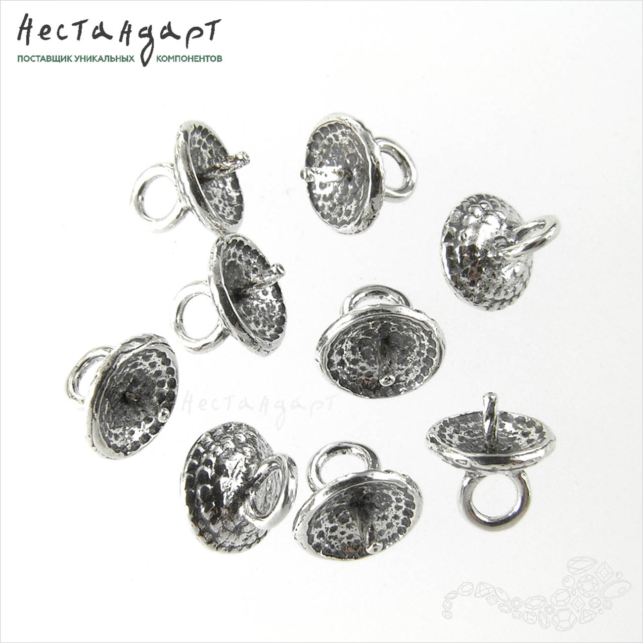 Очень красивая, нарядная чашечка-концевик из гипоаллергенного черненного стерлингового серебра. Рельеф чашечки имеет геометрический орнамент, похожий на драконью чешую или древнее плетение. Купол чаши концевика слегка овальный, что дает дополнительные возможности применения овальных и геометричных камней под вклейку. Петля на концевике паяная, для надежного монтажа к изделию. Размер штифта 3х0,6 мм