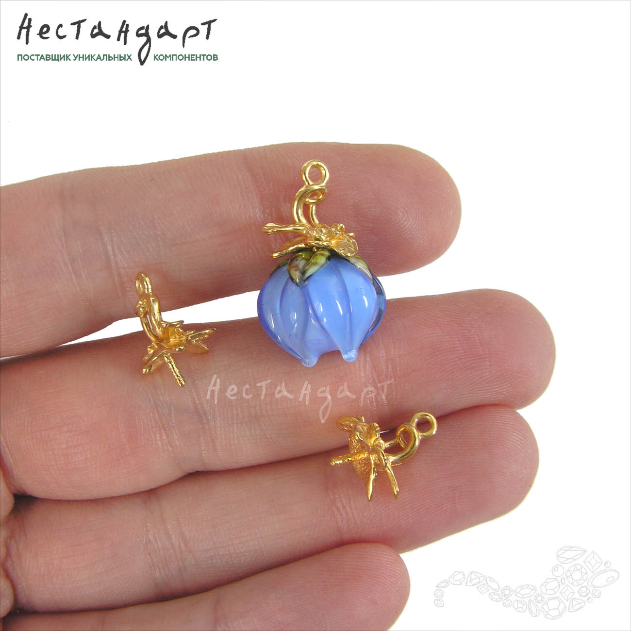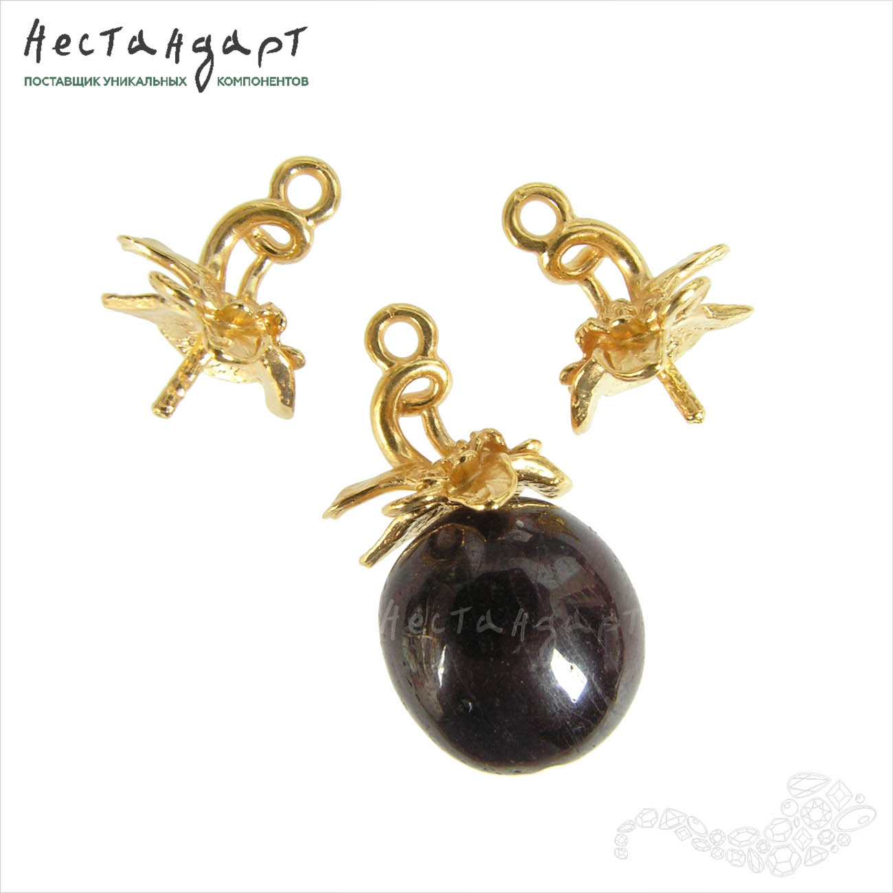 Весенний концевик с нотками тропического рая создан из латуни, покрыт высокопробным гипоаллергенным золотом 875 пробы. Декоративная шапочка концевика украшена кустиком фиалок, нежным и игривым завитком лозы, внутренние пространства которого можно использовать для монтажных целей. Чаша для ювелирной вставки текстурирована для лучшего сцепления с клеем. Размер удерживающего штифта 4х1 мм.
