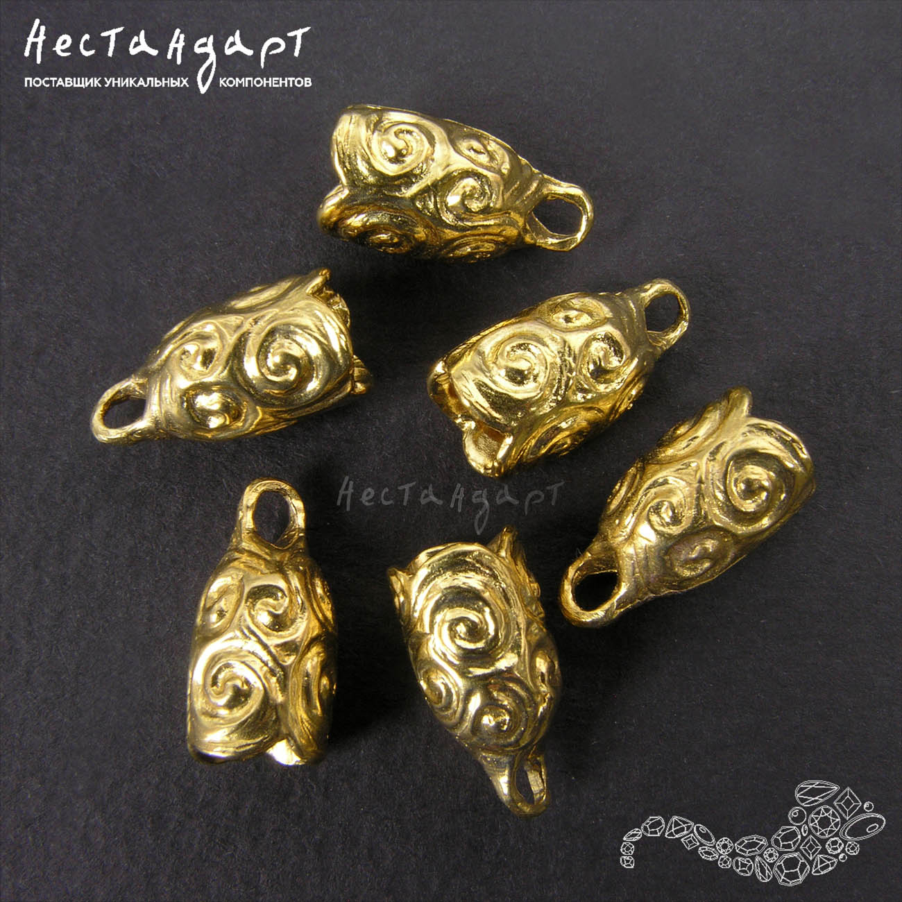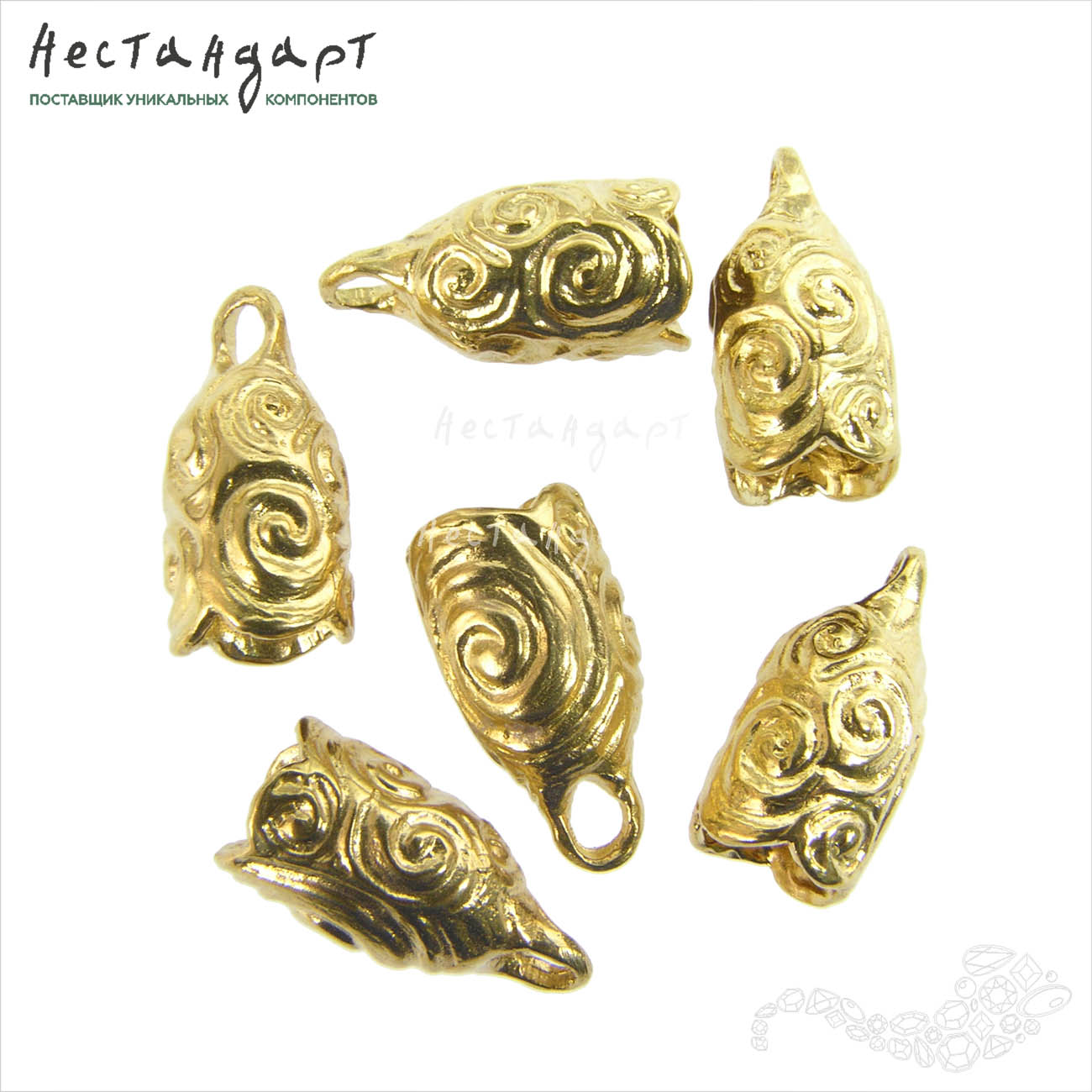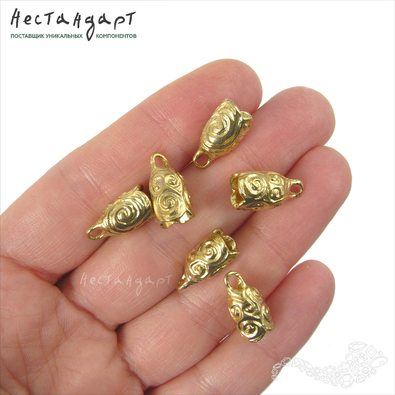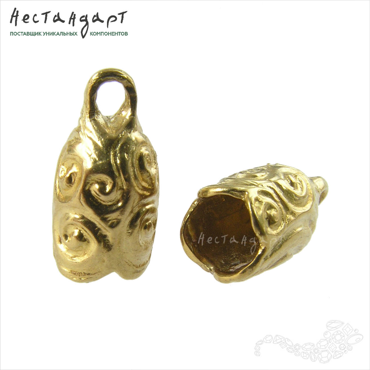 Спирали скифских орнаментов, лабиринты Эллады, эмоциональная европейская живопись - столько ассоциаций поднимается в душе от созерцания этого необычного рельефа. Концевик изготовлен из латуни, без покрытия, цвет четко ассоциируется с древними драгоценными находками. Высокий стаканчик концевика не имеет внутреннего штифта, что делает его крайне удобным для вклейки кристаллов, каплевидных бусин, текстильных и кожаных шнуров. Глубина чаши 9,5 мм, внутренний диаметр 5,3 мм.
