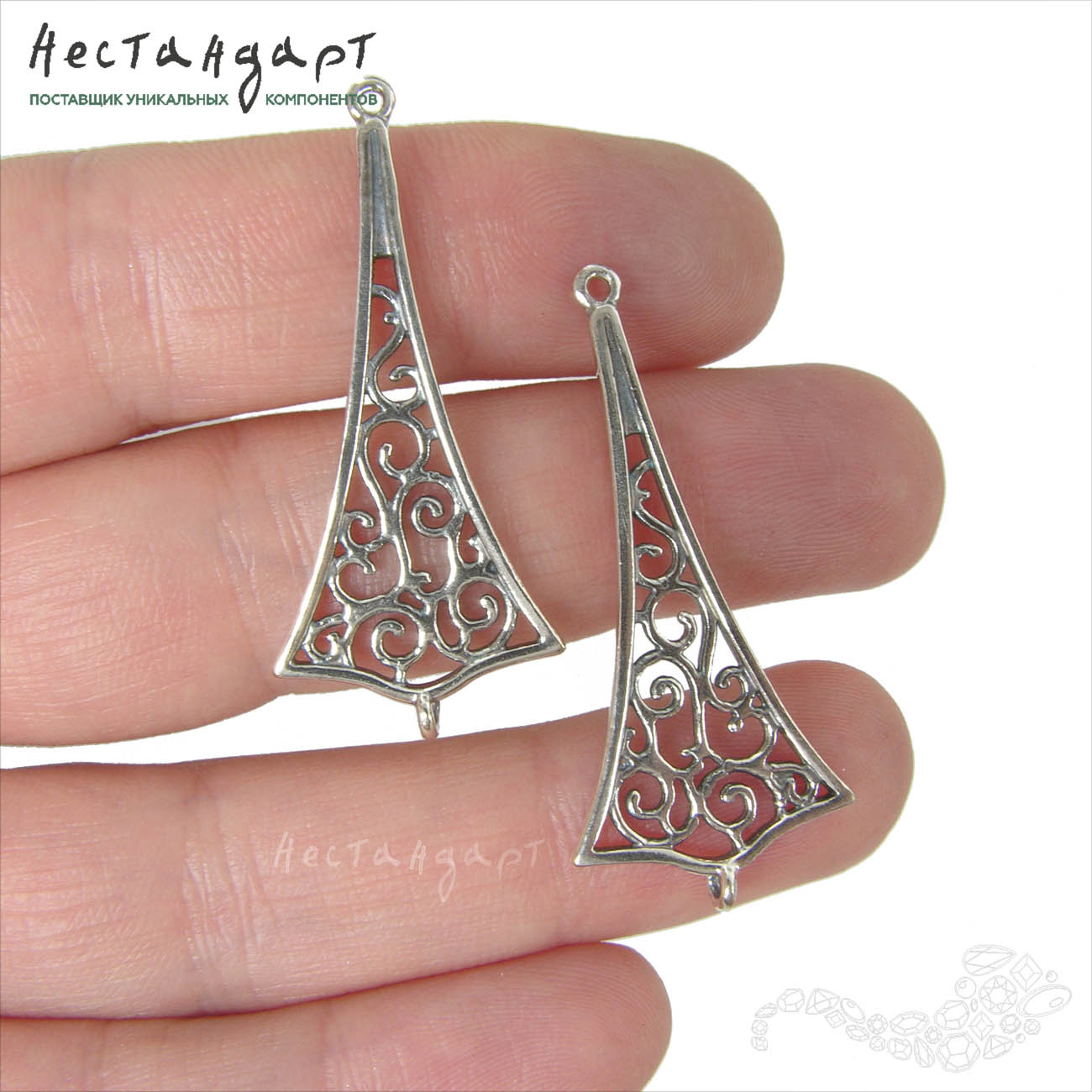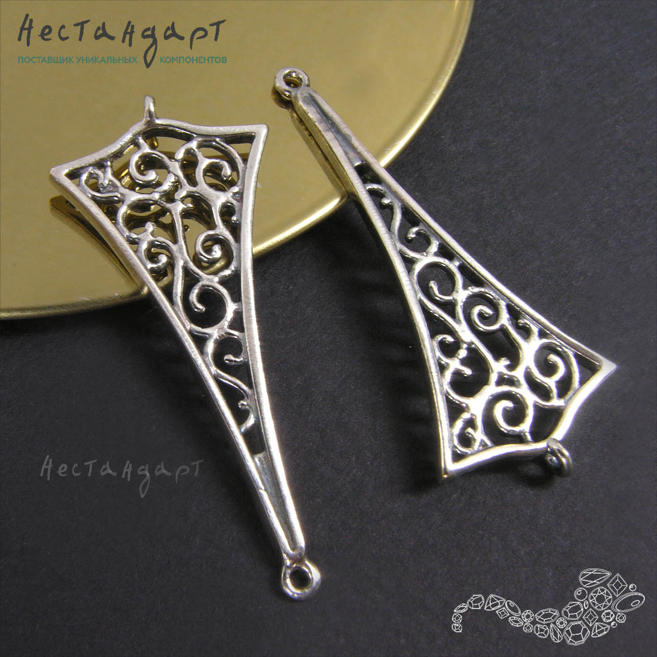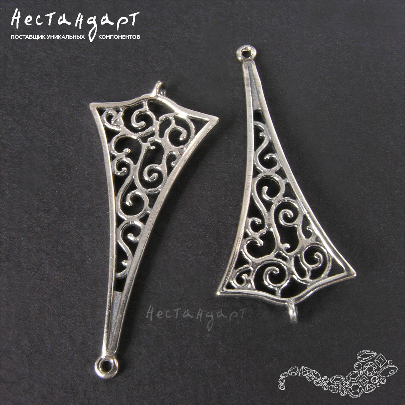 Двухсторонний коннектор создан из ювелирной латуни, покрыт высокопробным гипоаллергенным серебром 999 пр, оксидирован. Внутреннее пространство благодаря ажурности становится прозрачным и легким, будто растворяет вес формы, но вместе с этим насыщает образ деталями, лабиринтом завитков. Коннектор будет идеальной подвеской для серег или деталью обрамляющей центральный элемент (часы или акцентный камень на браслете). Петли для монтажа разъемная и паяная, расположены перпендикулярно друг другу.