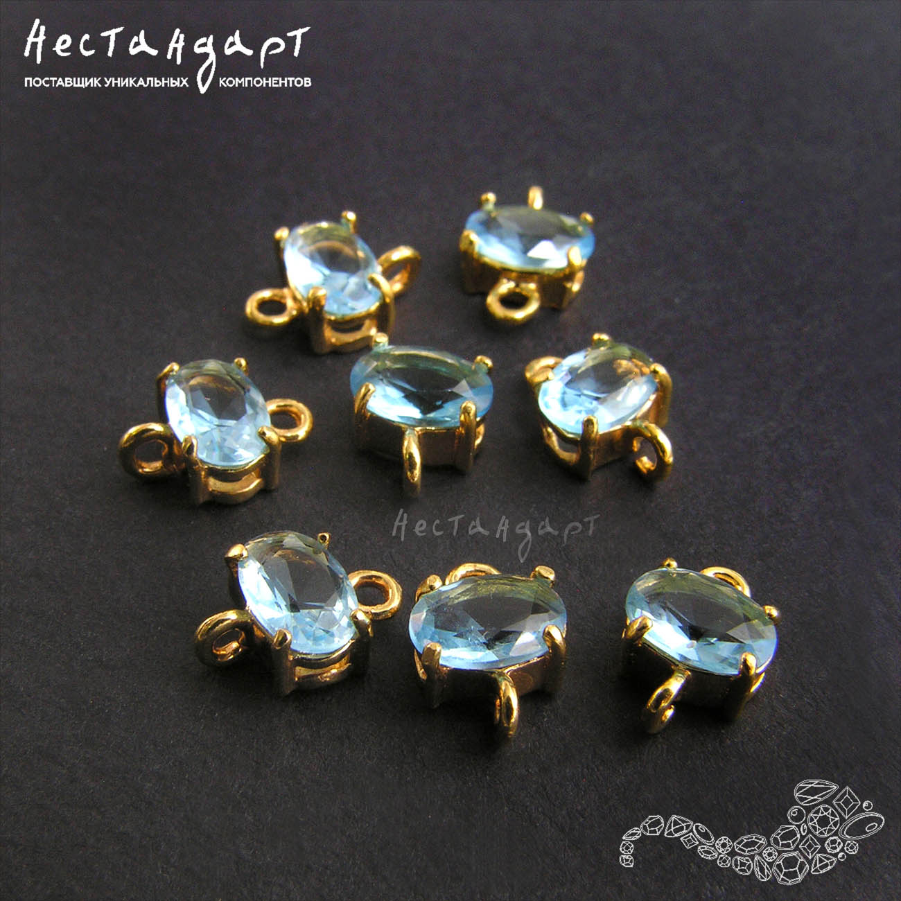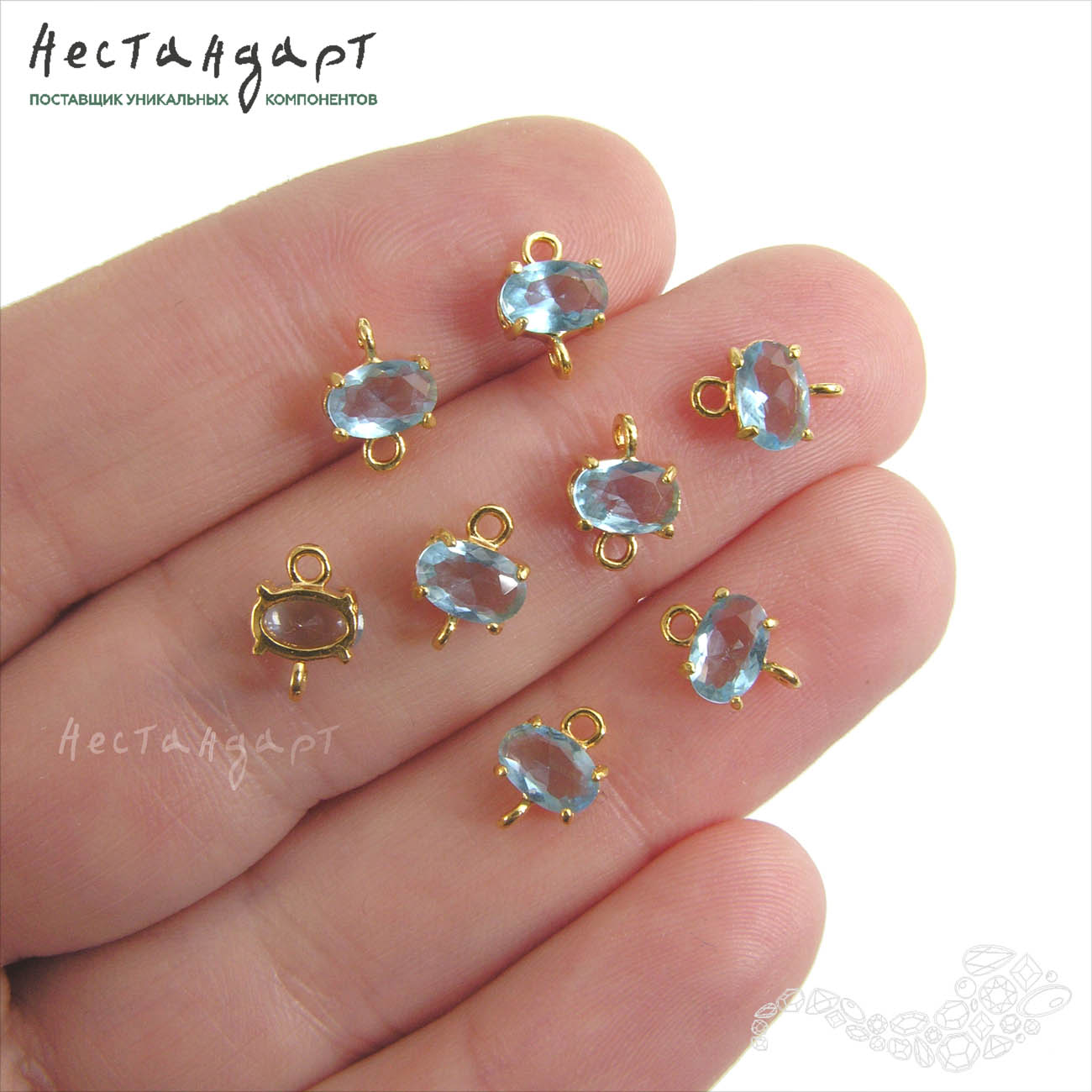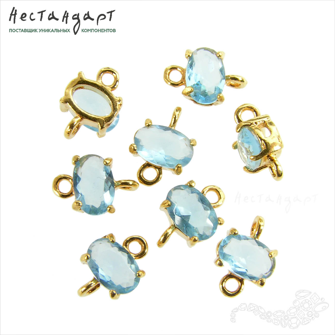 Коннектор создан из ювелирной латуни, покрыт высококачественным гипоаллергенным золотом 875 пробы. Ограненная ювелирная вставка выполнена их хрусталя прекрасного оттенка голубого топаза. Размер вставки 6х4 мм. Коннектор имеет разнонаправленные петли (паяную и разъемную) с внутренним диаметром ок. 1,5 мм. В касте есть отверстия, которые при необходимости можно использовать как пришивные.