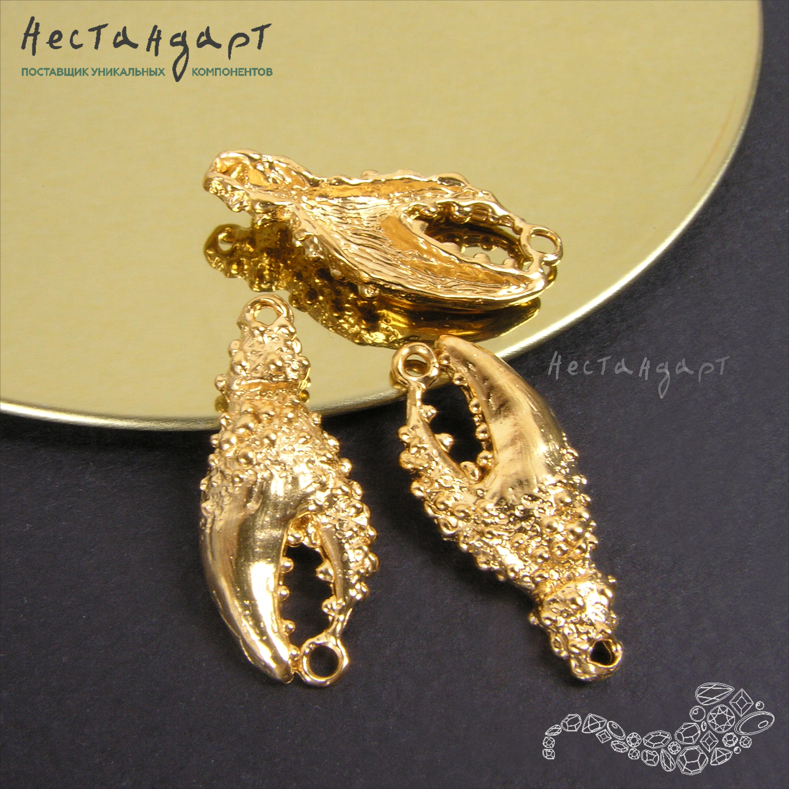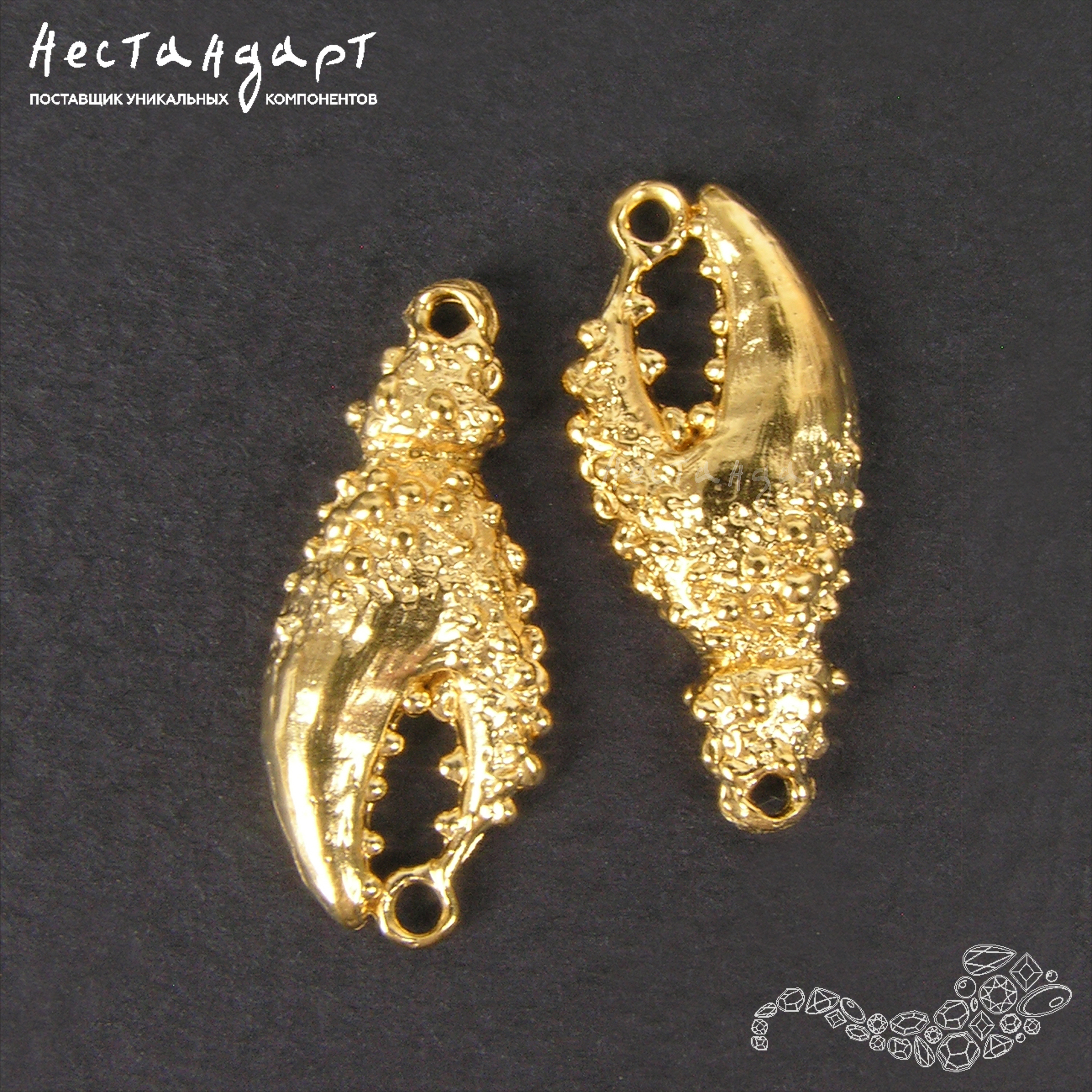 Чудные коннекторы в виде крабовых клешней из нашей морской коллекции выполнены из высококачественной ювелирной латуни покрыты высокопробным, гипоаллергенным золотом 999 пробы. Не тускнеющее сияющее драгоценное покрытие и оригинальный силуэт обязательно привлекут внимание, напомнят вам о теплом море. Этот авторский дизайн отличается высочайшим уровнем проработки и детализации.