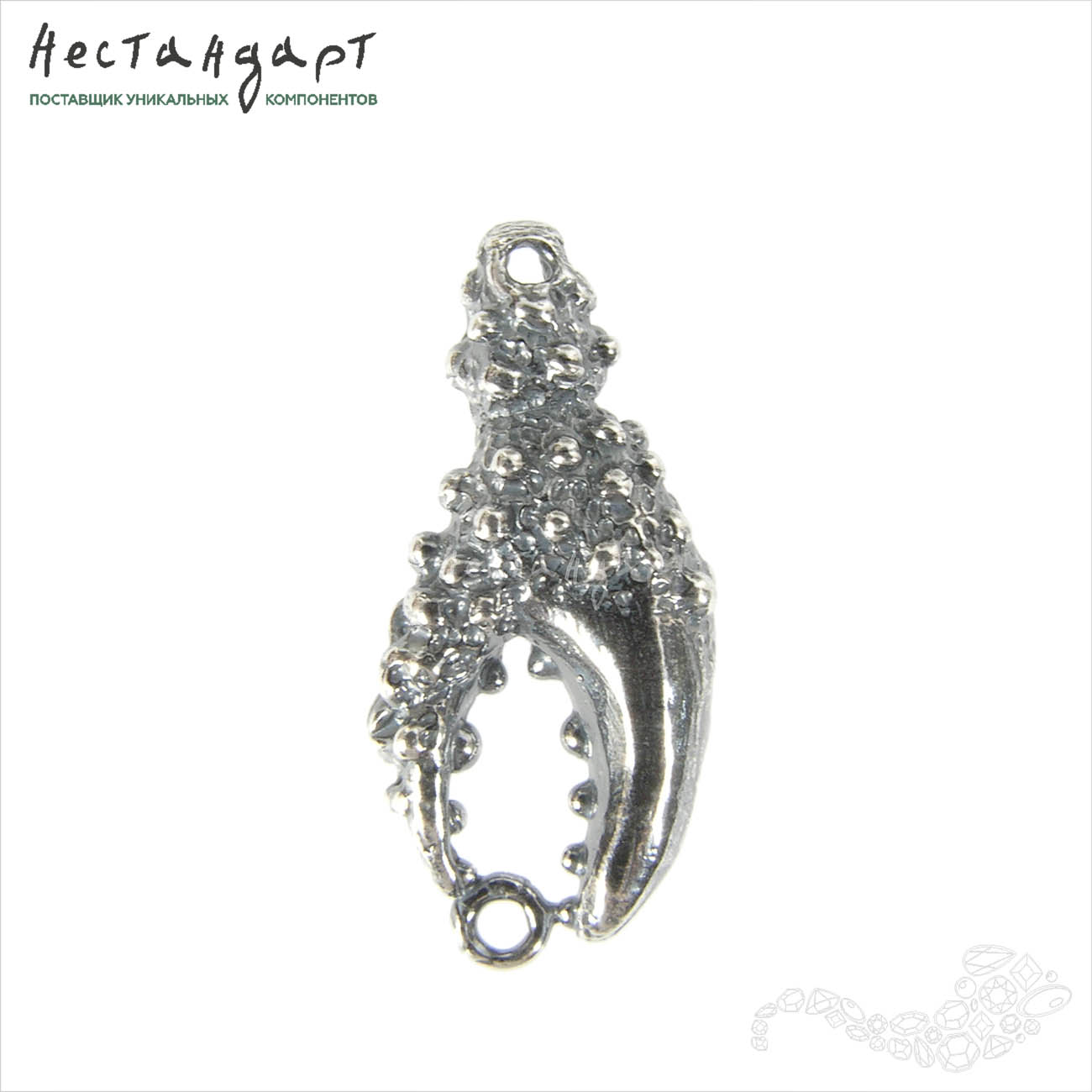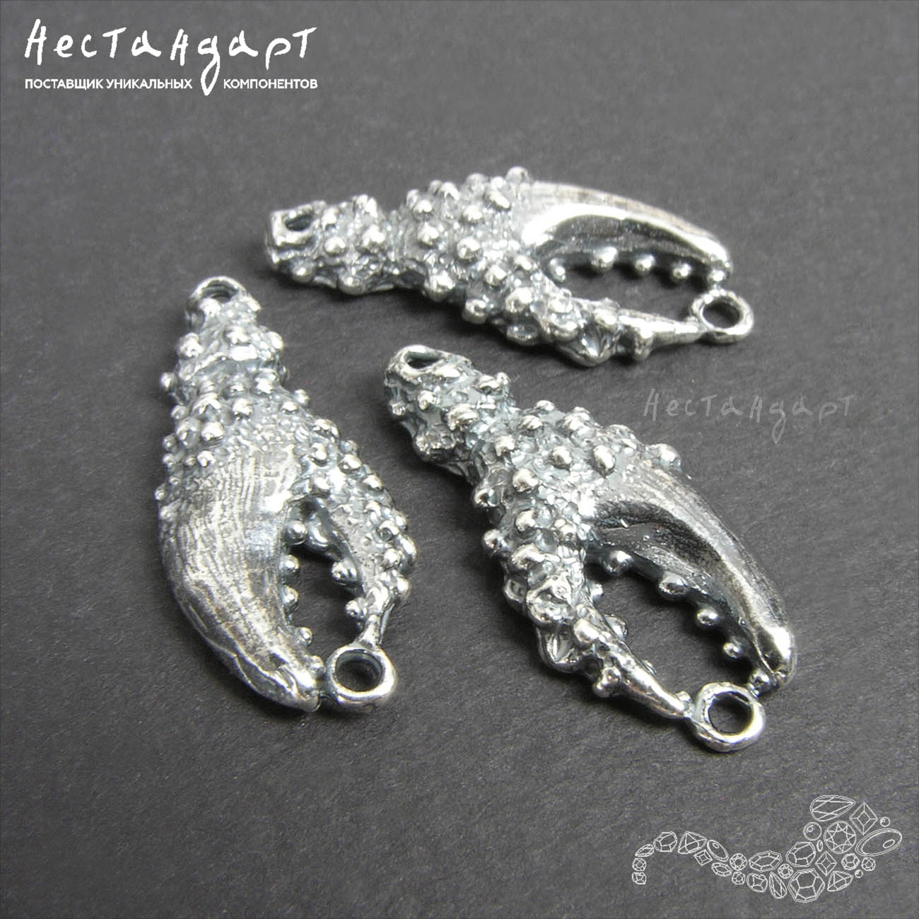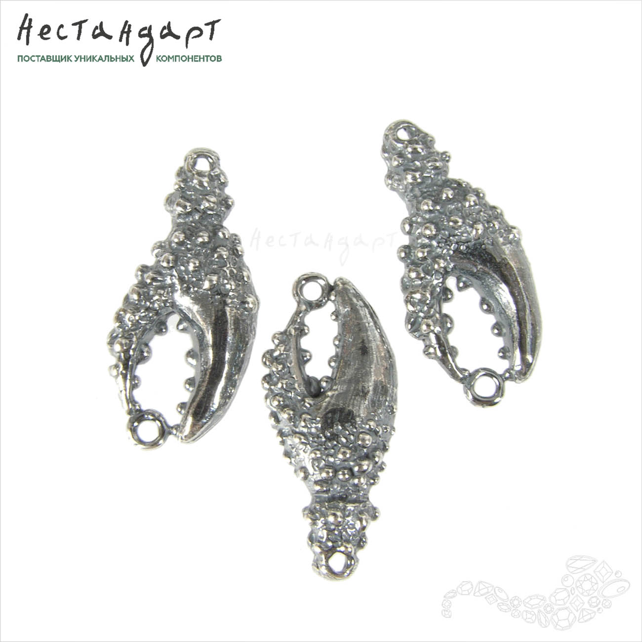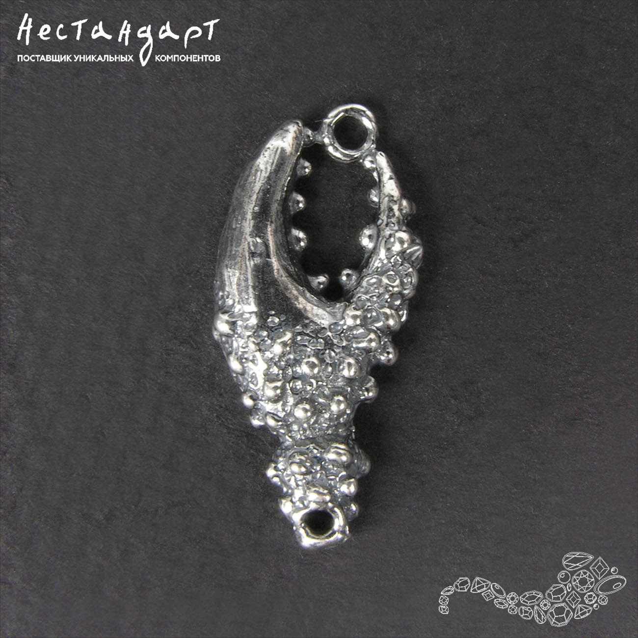 Чудные ювелирные коннекторы в виде стилизованных клешней краба из нашей морской коллекции выполнены из высококачественной латуни покрыты высокопробным, гипоаллергенным серебром 999 пробы. Оксидирование эффектно подчеркнуло сложный, суровый, весьма реалистичный рельеф и такую тонкую проработку. Драгоценное покрытие не потемнеет, не потускнеет во время носки. Коннектор обязательно привлечет внимание, напомнит о любимом море и его переменчивом характере.