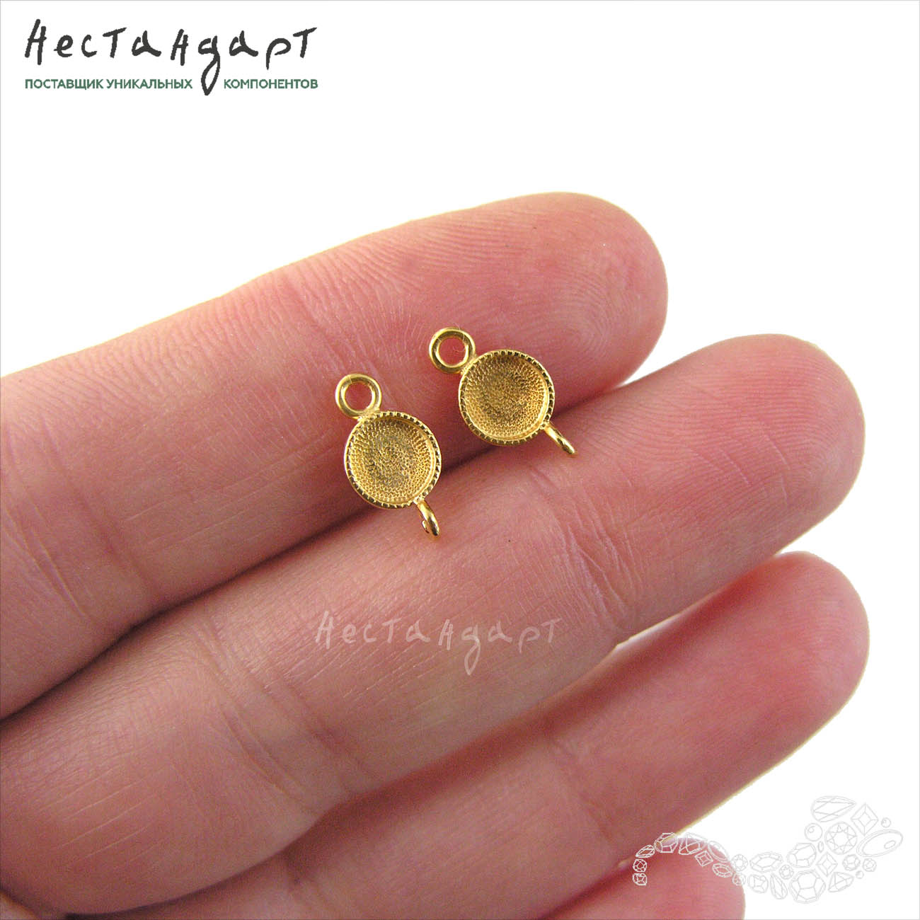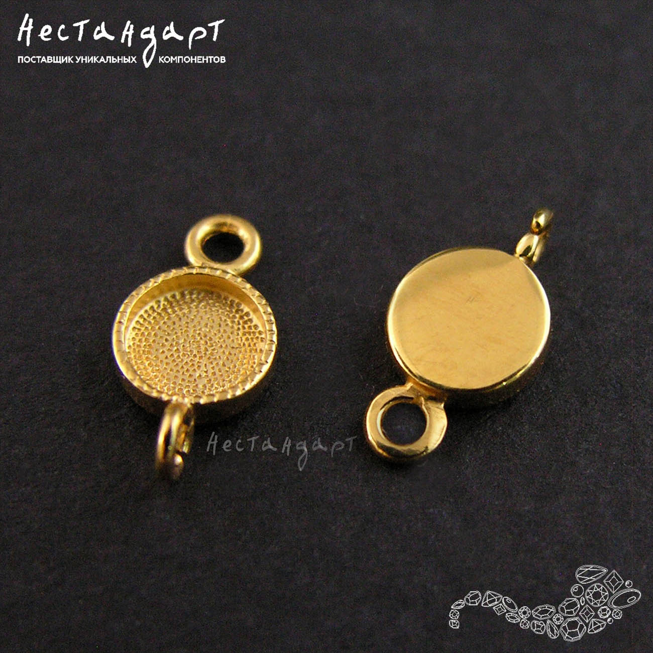 Коннектор с сеттингом под вклейку из гипоаллергенного позолоченного стерлингового серебра. Чаша для вклейки имеет глубину 1,2 мм, диаметр 5,2 мм. Дно сеттинга фактурное, для лучшего сцепления с клеем (смолой, эмалью). Коннектор - полноценное декоративное звено для серег, колье и браслетов, имеет две петли, развернутые на 90 градусов относительно друг друга, что крайне удобно для последовательного соединения одинаковых элементов. Одна из петель разомкнута, внут. диам. 1,5 мм.