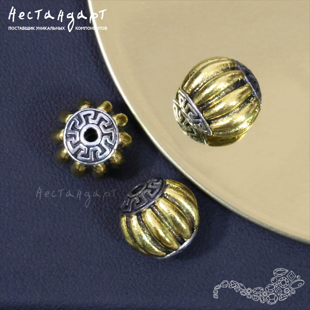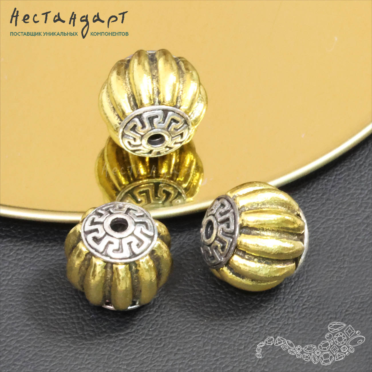 Рельефная золоченая декоративная бусина из меди. Напоминает по форме коробочку мака, тыкву или бутон цветка. Украшены изящным серебристым меандром на чашечках вокруг отверстий