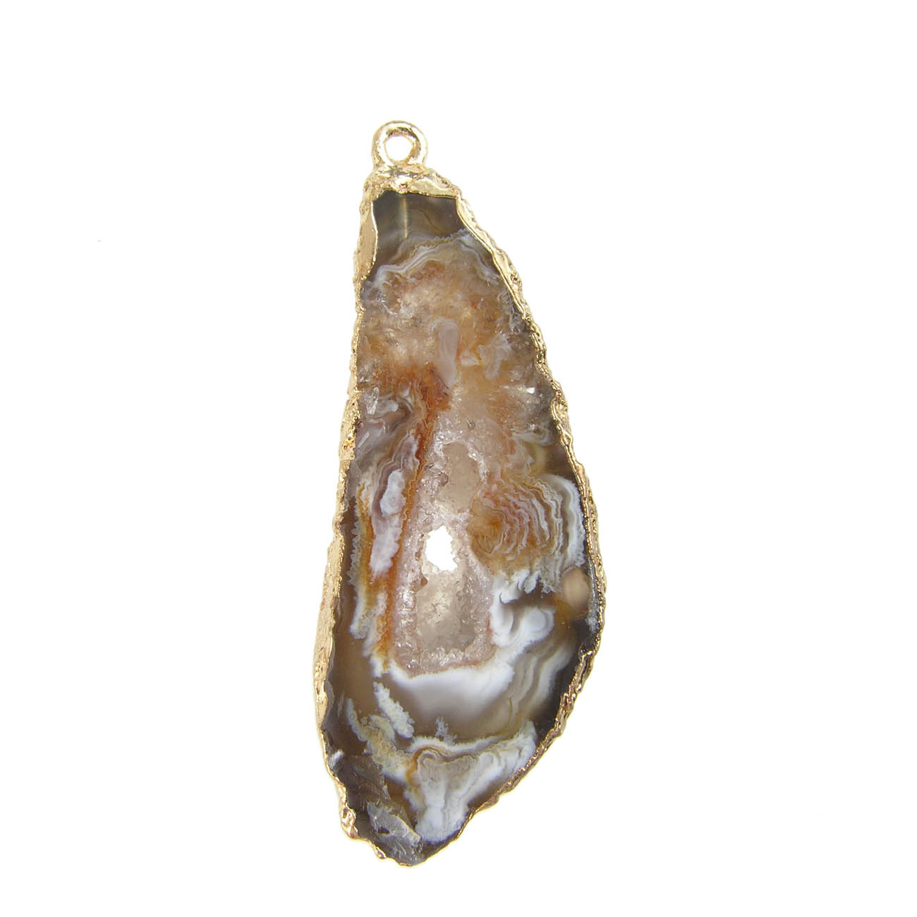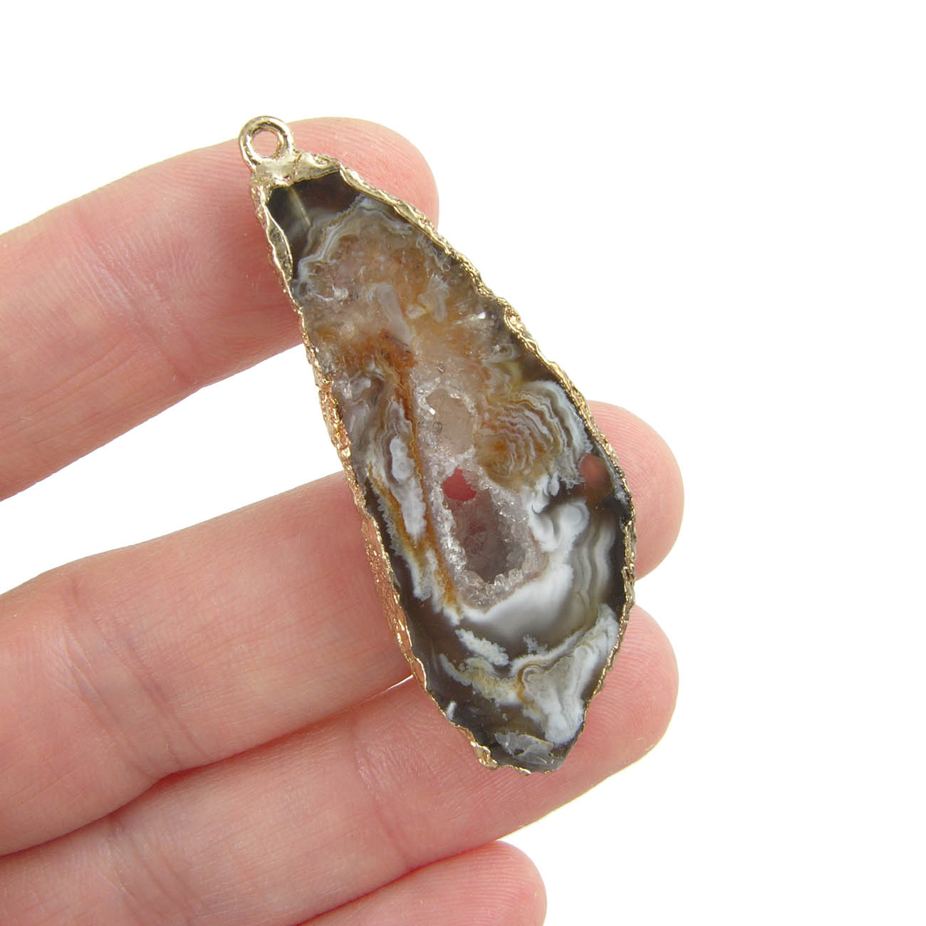 Восхитительные и совершенно уникальные подвески из среза жеоды натурального агата с кварцевыми кристаллами. Подвески в металлической оправе золотого цвета, имеют 1 замкнутую петлю ок 2 мм. для надежного монтажа.
