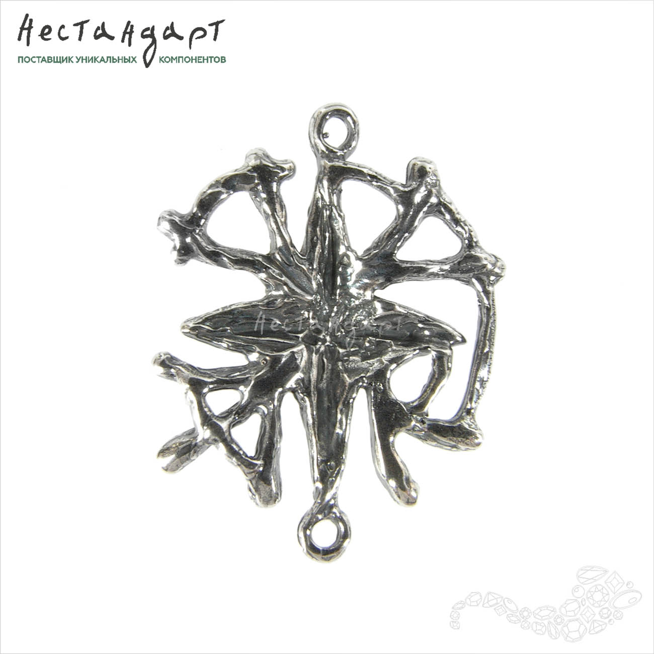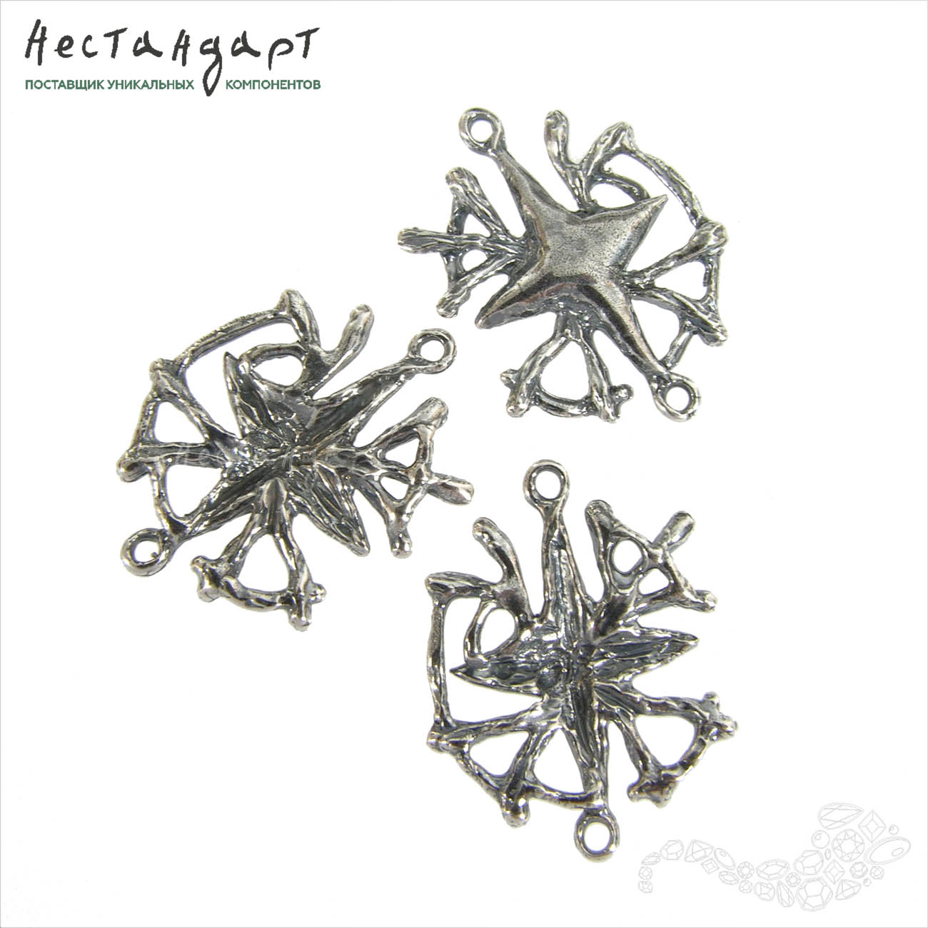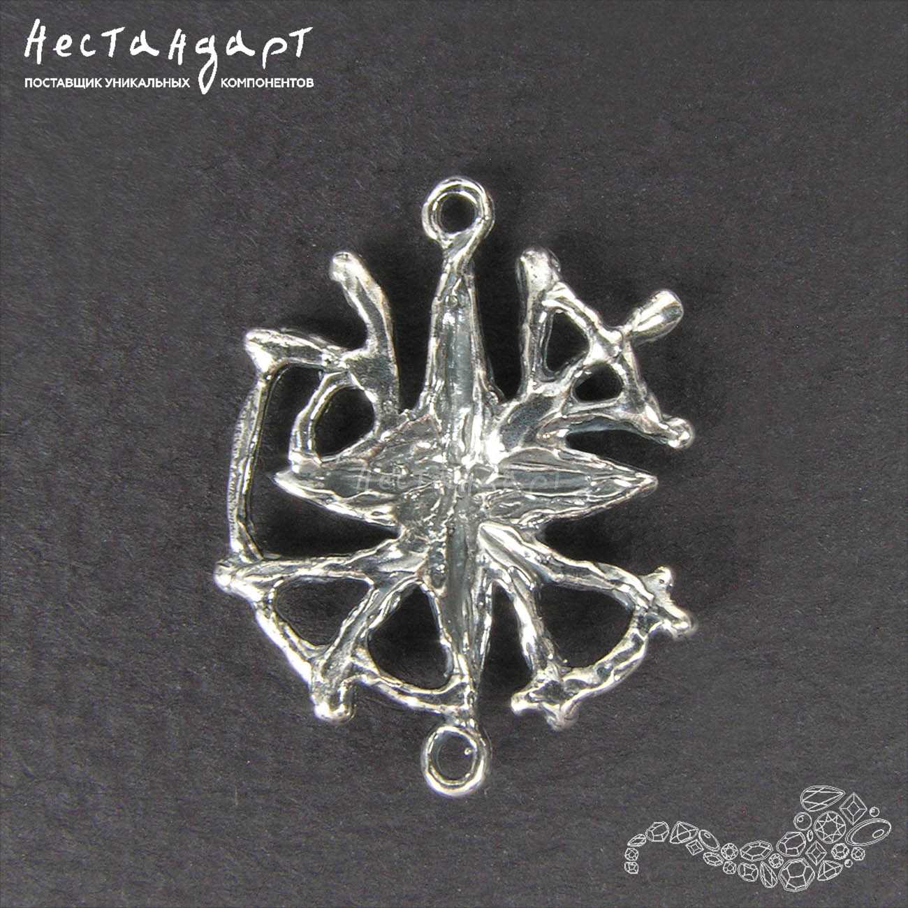 Необычный, крупный коннектор в виде путеводной звезды сделанный из ювелирной латуни, покрытый высокопробным серебром 999 может стать прекрасной основой для украшения, вокруг которого можно построить историю посвященную самому необычному морскому путешествию. Две паяные петли на концах звезды