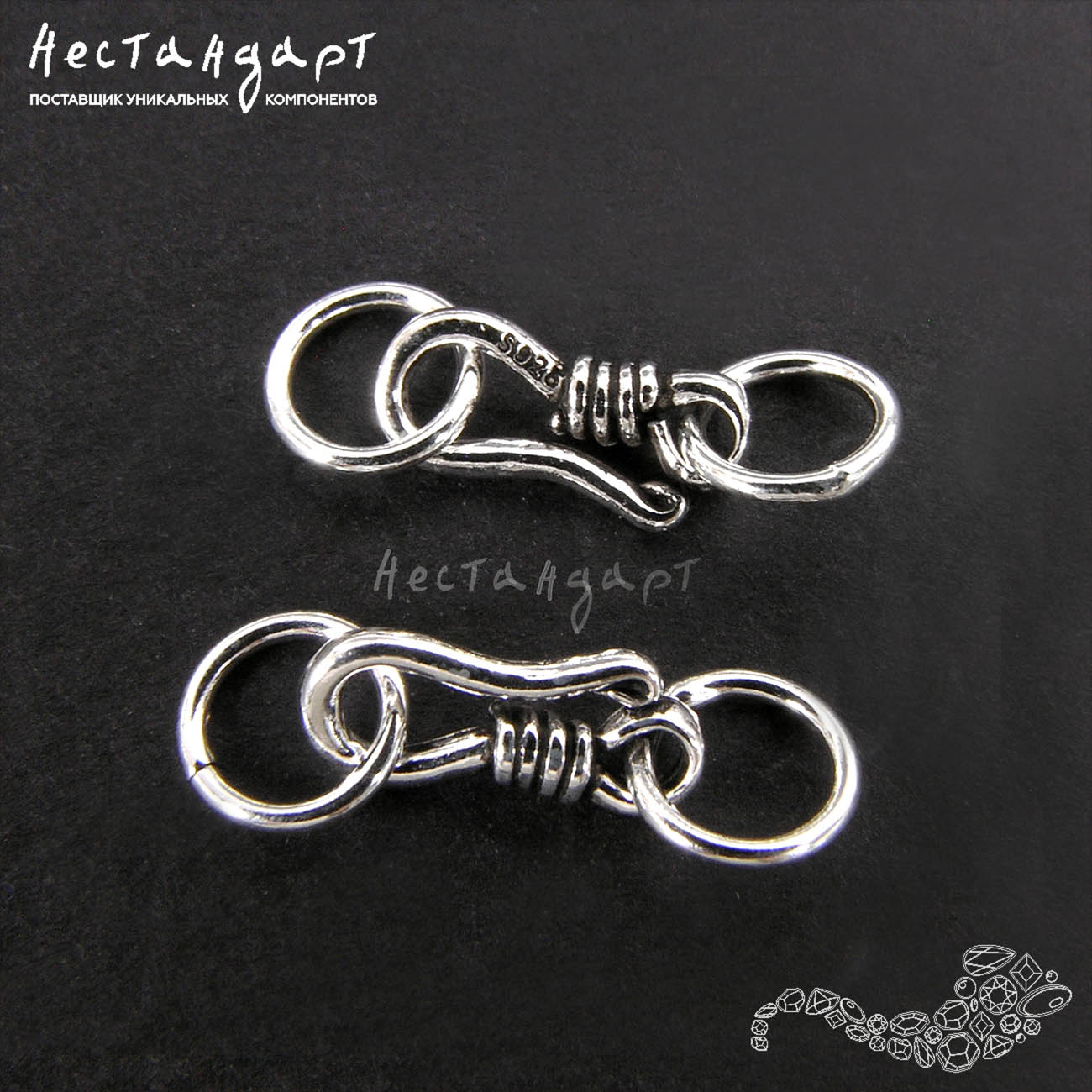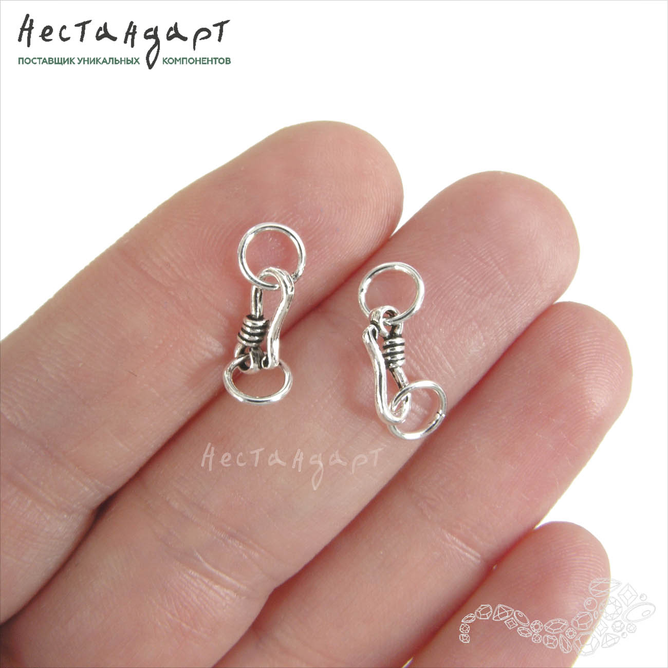 Красивый, удобный, надежный комплект: замок-крючок украшенный бусиной-пружинкой и монтажные кольца. Изящное решение, если вам наскучили обычные замки. Крючки созданы из гипоаллергенного стерлингового серебра 925, чернены. Размер крючка 10х5 мм. Диаметр монтажного и ответного паяного кольца 6 мм