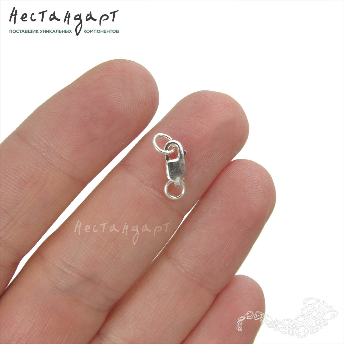 Ювелирный замок выполнен из серебра 925 пробы, гипоаллергенен, подходит для людей с чувствительной кожей. Замок удобно открывать и закрывать одной рукой. Укомплектован ответными паяным и монтажным кольцами для крепления к изделию