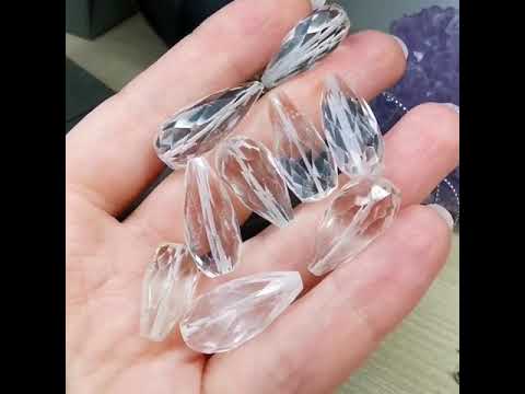 Крупные бусины-капли с ювелирной огранкой из натурального кварца. Камни имеют небольшое количество включений, редкие спайки. Бусины кварца огранены вручную, могут различаться габаритными размерами, рисунком огранки. Некоторые экземпляры имеют несовершенства у отверстия.