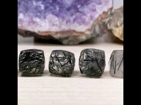Кварц различной степени прозрачности со включениями кристаллов черного турмалина и характерной для для этого минерала "морозной" фактурой. Бусины очень стильные и графичные, огранены в форме объемного куба, могут различаться габаритными размерами. В некоторых местах включения имеют выход на поверхность.