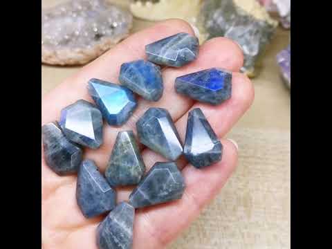 Симпатичные бусины из натурального лабрадора, сложной формы, с крупным геометрическим гранением. Оттенки иризации чаще синие и голубые. На поверхности могут присутствовать трещинки и включения характерные для этого камня. Габаритные размеры, форма и гранения у всех бусин разная.